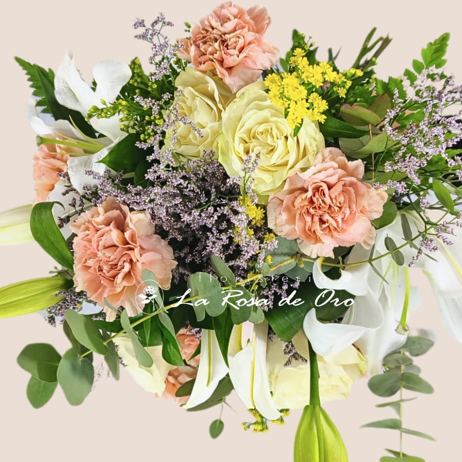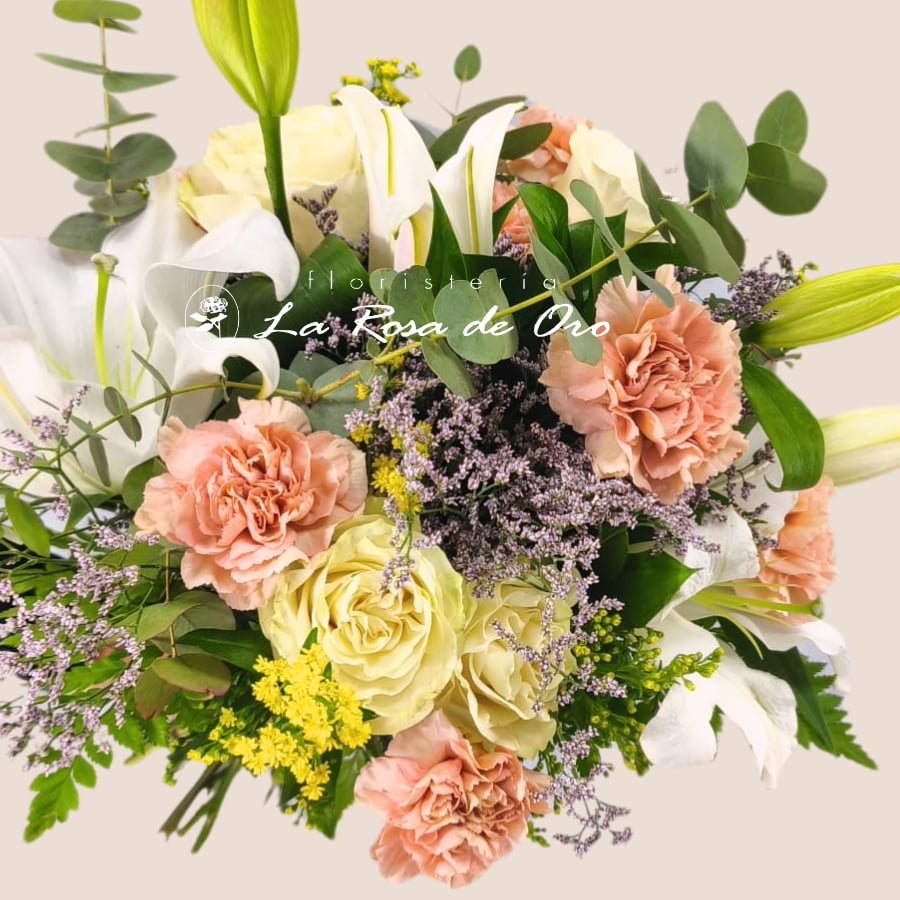 Elegancia Pastel es un ramo exclusivo que destaca por su armonía de colores suaves y su diseño elegante. Compuesto por rosas en tonos crema, lilium blancos y una cuidada selección de flores pastel como claveles, limonium y solidago, este bouquet transmite delicadeza, ternura y sofisticación en cada detalle.