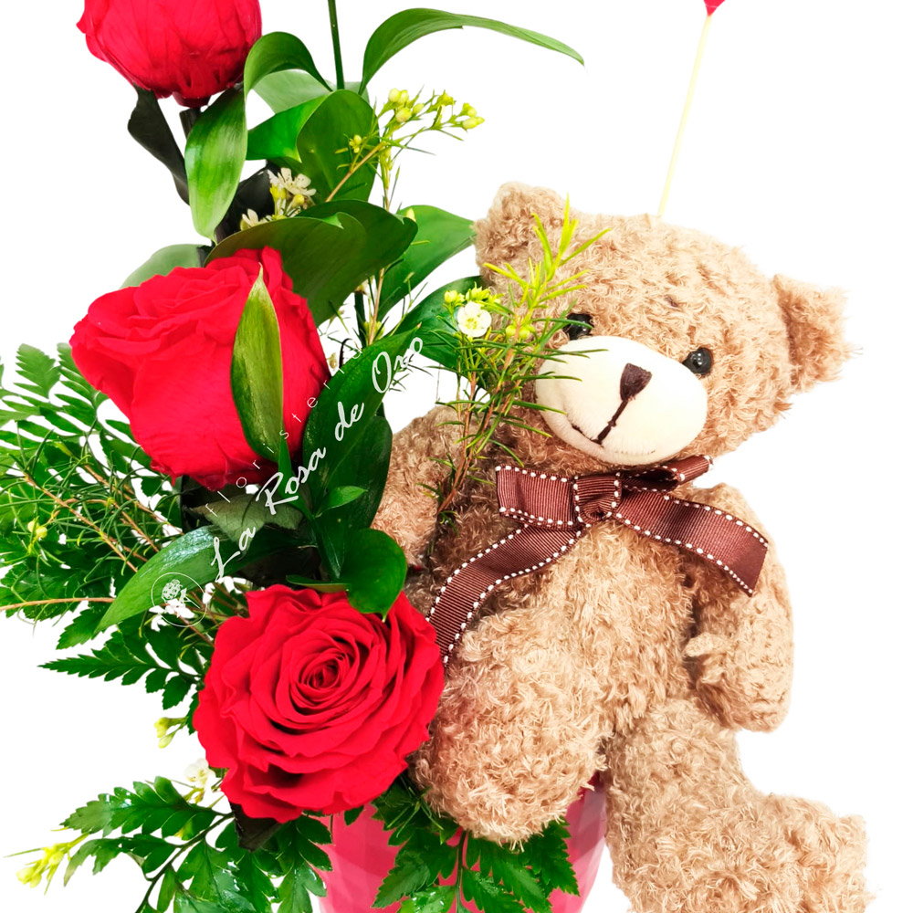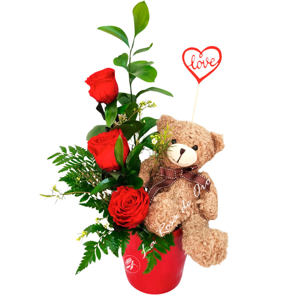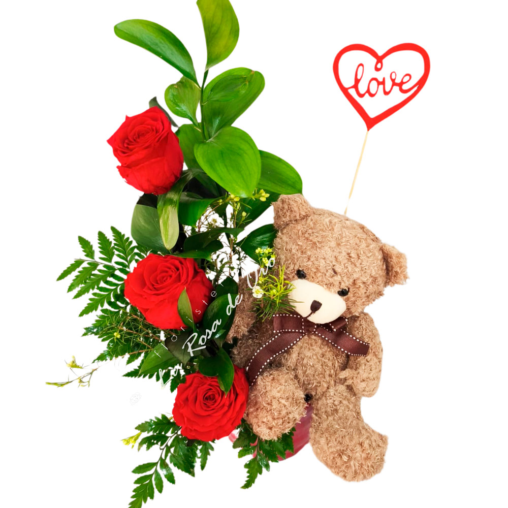 El conjunto se presenta en una base de cerámica, acompañado de un hermoso pick con motivo romántico, un tierno peluche en forma de oso y una caja de bombones Nestlé (43 g), aportando dulzura y emoción al regalo. Incluye conservante floral para prolongar la frescura de las flores y tarjeta de felicitación personalizada.